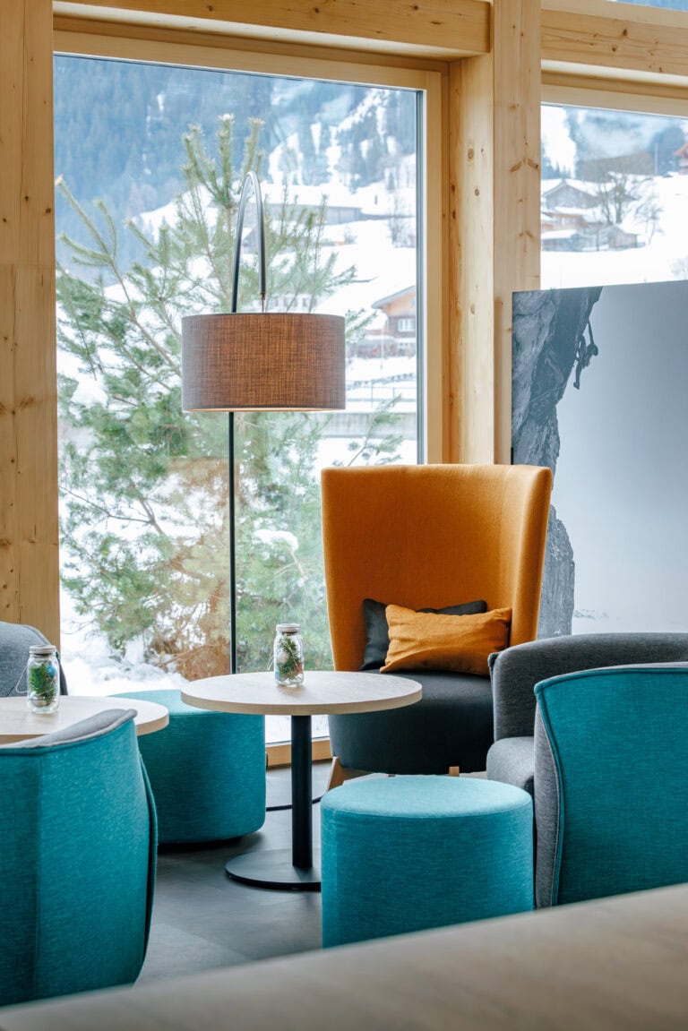 In unserer neu renovierten Lounge kannst du dich entspannen, einen Kaffee trinken und den fantastischen Blick aus dem Fenster auf die Eiger Nordwand geniessen.