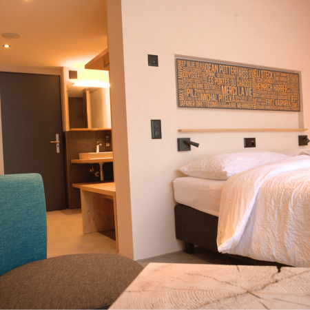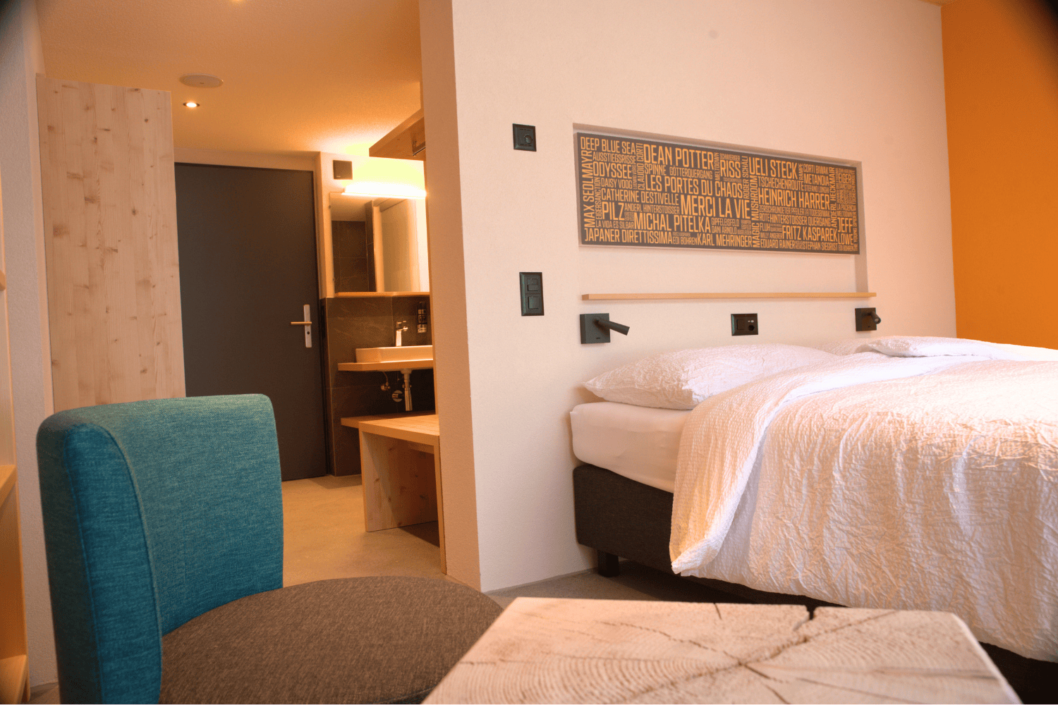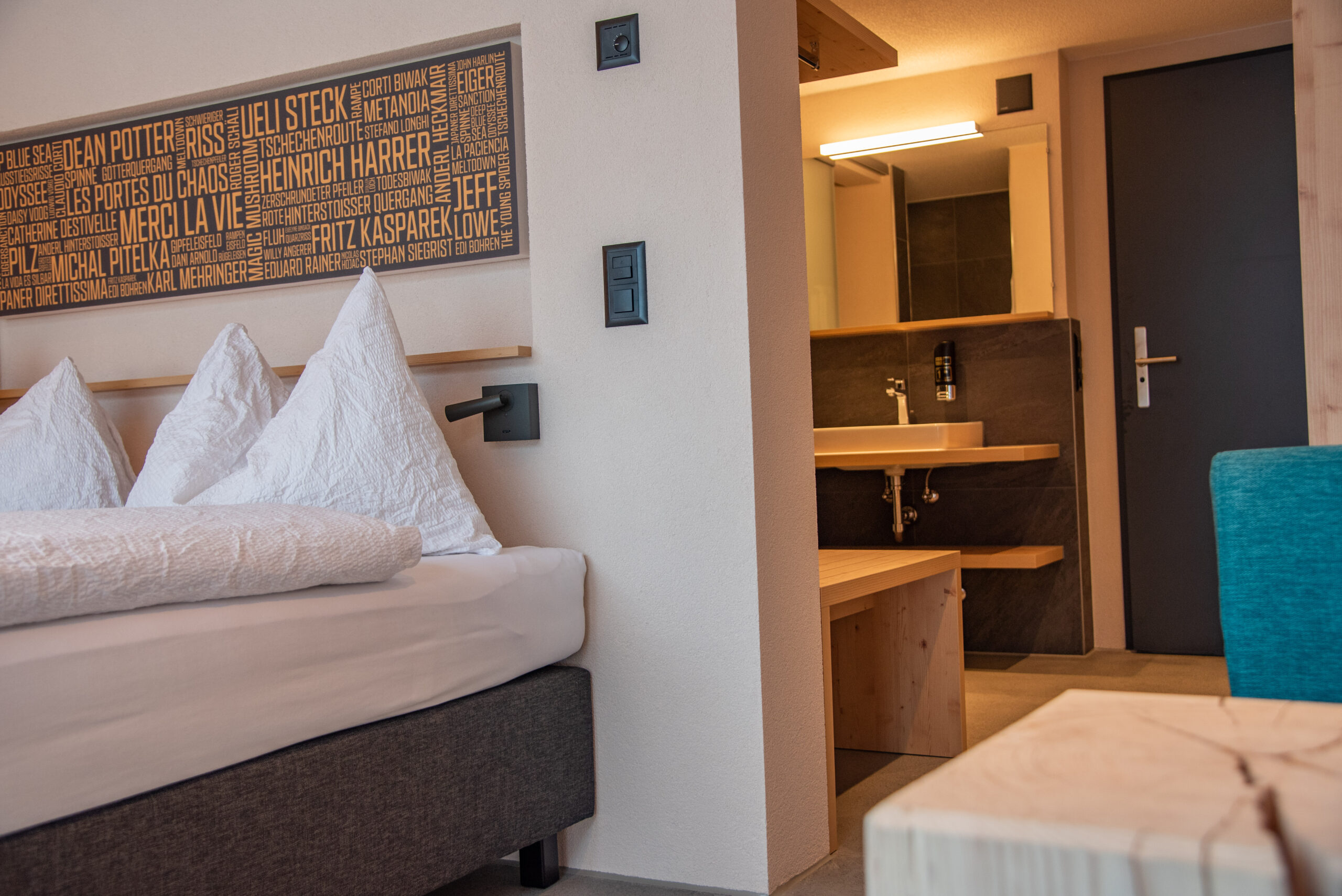 Double room in the Eiger Lodge Chic with box-spring bed, TV, large window front, south-facing balcony and partial mountain view. In these rooms, everything revolves around the wall: the Eiger North Face and its climbers. Which inspiring north face story awaits you in your room remains a secret until you arrive. Bed linen and towels are included.