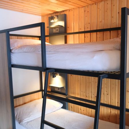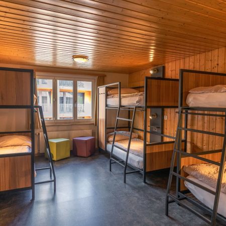 Alle unsere 6-Bett-Privatzimmer in der Eiger Lodge Easy sind mit Kajütenbetten, einem Waschbecken, abschliessbaren Schrank sowie einem Licht pro Bett ausgestattet. Die Dusch- und Toilettenanlage befindet sich auf der Etage (Erdgeschoss). Bettwäsche ist inklusive, Frottéewäsche kann auf Wunsch gemietet werden.