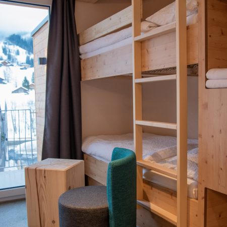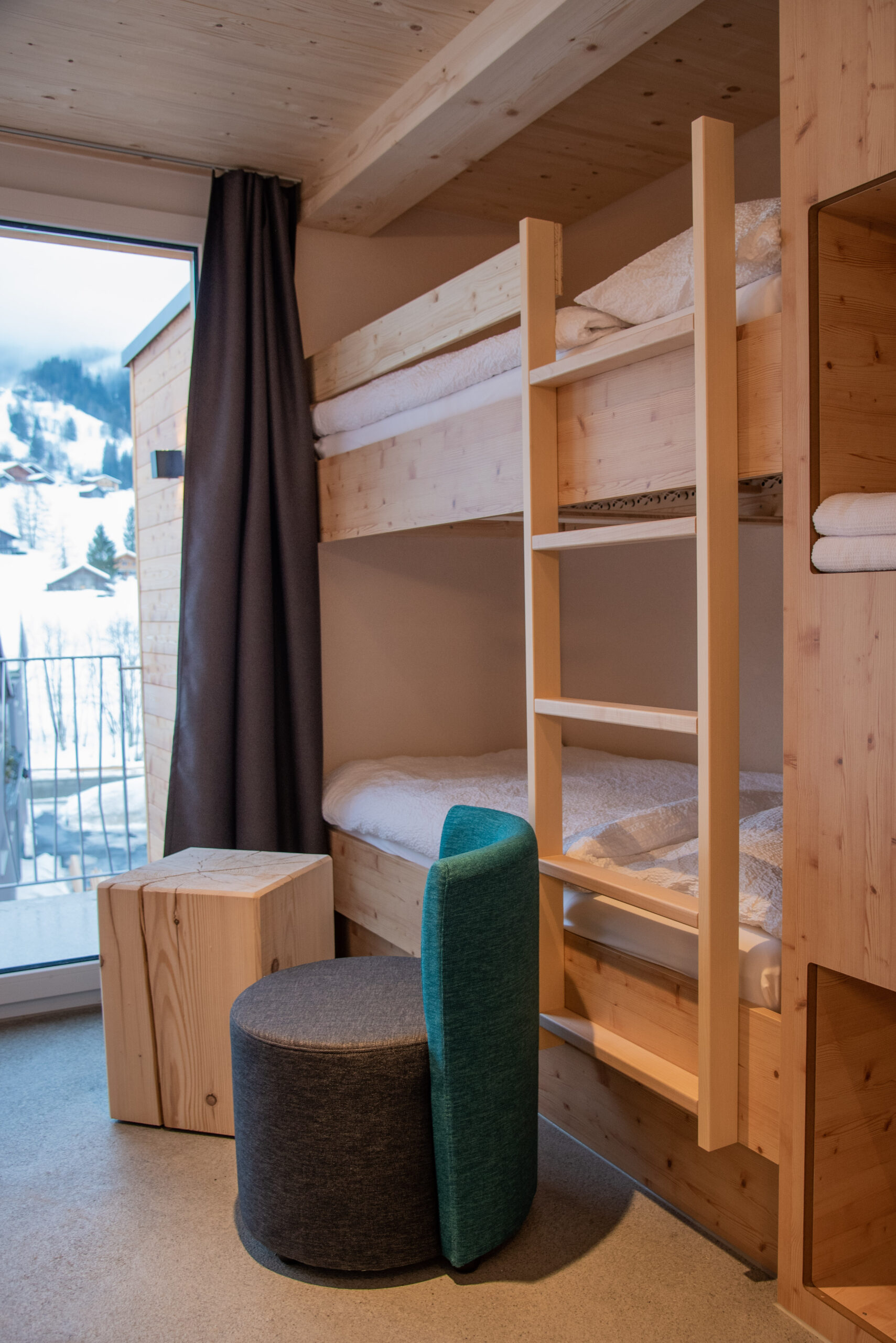 Familienzimmer für 4 Personen in der Eiger Lodge Chic mit Boxspringbett, Kajütenbett, TV, grosser Fensterfront, Südbalkon und teilweise Bergsicht.